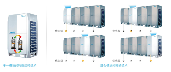 系統(tǒng)根據(jù)系統(tǒng)負(fù)荷情況,輪換設(shè)置優(yōu)先開啟的室外機(jī)模塊的壓縮機(jī)順序,平衡分配每臺室外機(jī)模塊的運(yùn)行時間,大大提高了機(jī)組的可靠性和使用壽命。